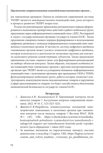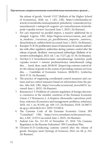 4. Куроптев Н. Б. О проблемных вопросах взаимодействия таможенных органов с другими контролирующими органами при таможенном контроле после выпуска товаров. Бюллетень инновационных технологий. 2023. Т. 7. № 3 (27). С. 32-36.