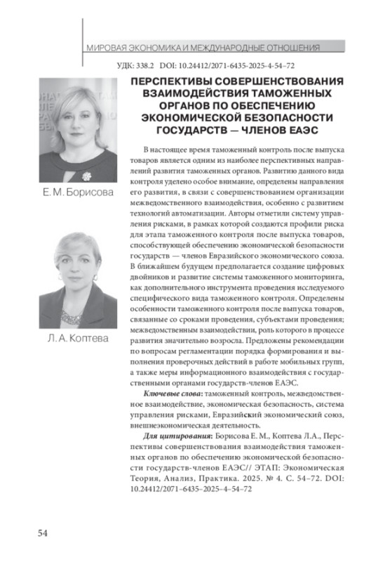 В настоящее время таможенный контроль после выпуска товаров является одним из наиболее перспективных направлений развития таможенных органов. Развитию данного вида контроля уделено особое внимание, определены направления его развития, в связи с совершенствованием организации межведомственного взаимодействия, особенно с развитием технологий автоматизации. Авторы отметили систему управления рисками, в рамках которой создаются профили риска для этапа таможенного контроля после выпуска товаров, способствующей обеспечению экономической безопасности государств - членов Евразийского экономического союза. В ближайшем будущем предполагается создание цифровых двойников и развитие системы таможенного мониторинга, как дополнительного инструмента проведения исследуемого специфического вида таможенного контроля. Определены особенности таможенного контроля после выпуска товаров, связанные со сроками проведения, субъектами проведения; межведомственным взаимодействии, роль которого в процессе развития значительно возросла. Предложены рекомендации по вопросам регламентации порядка формирования и выполнения проверочных действий в работе мобильных групп, а также меры информационного взаимодействия с государственными органами государств-членов ЕАЭС.