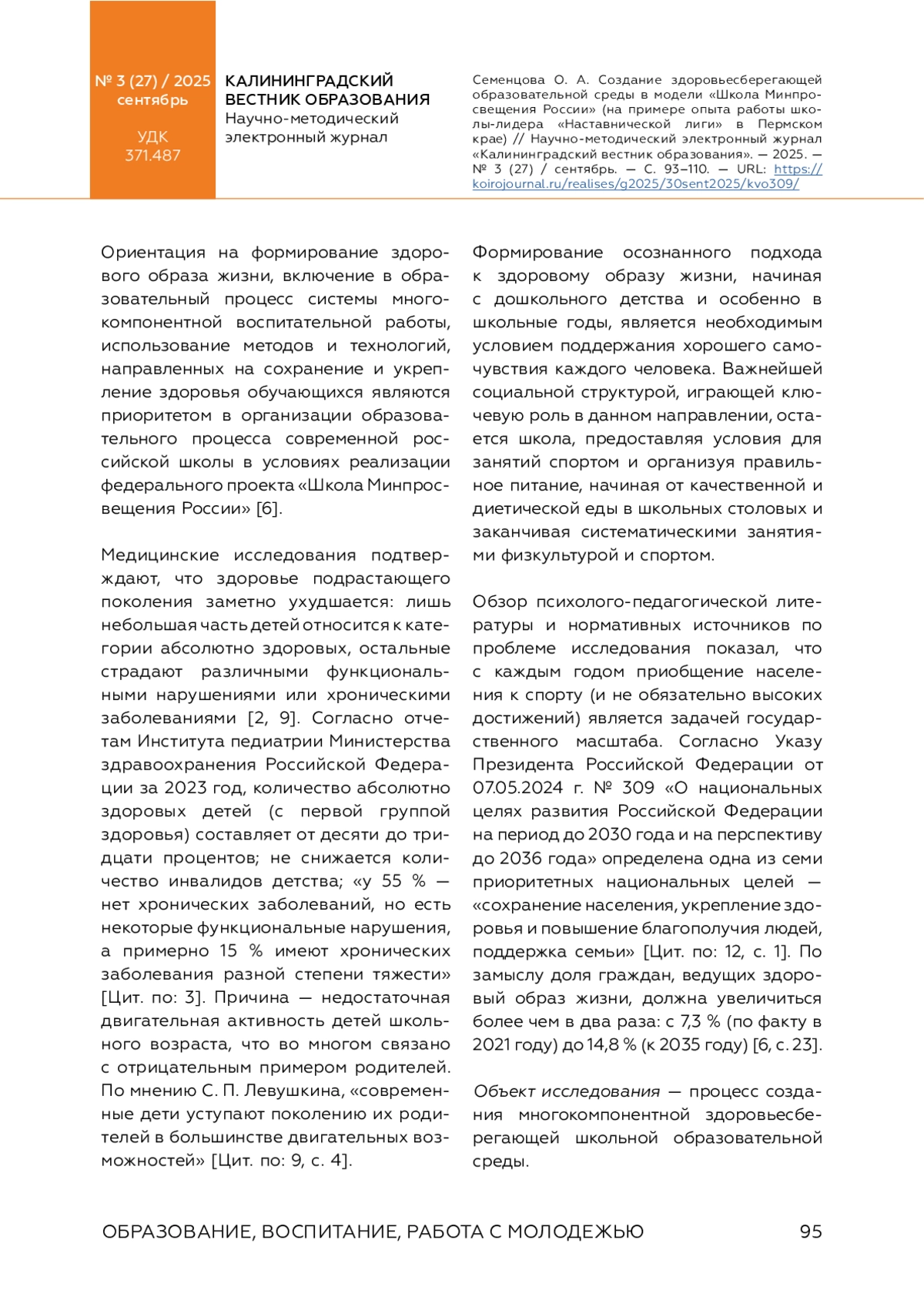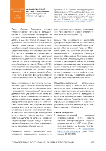 В статье акцентируется внимание на проблеме ориентации образовательного процесса современной школы на создание здоровьесберегающей образовательной среды с включением системы многокомпонентной воспитательной работы и здоровьесберегающих технологий. Подчеркивается значимость организации воспитательной деятельности, направленной на поддержание физического и психического здоровья обучающихся. Приводятся статистические данные, свидетельствующие о негативной динамике состояния здоровья российских школьников за последние годы. Теоретическая база публикации подкрепляется стратегическими приоритетами, обозначенными в указе Президента Российской Федерации, посвященном национальным целям развития страны на период до 2030 года и на перспективу до 2036 года, в том числе сохранении населения, укреплении здоровья и повышения благополучия людей, поддержке семей. Предметом исследования в статье является анализ результатов самодиагностики школ Пермского края и описание педагогического опыта работы одной из школ «Наставнической лиги» Пермского края в контексте создания здоровьесберегающей образовательной среды и формирования здорового образа жизни у обучающихся в модели проекта «Школа Минпросвещения России». Для этого обобщены результаты самодиагностики 463 школ Пермского края по магистральному направлению «Здоровье» в 2024 году. Приведен сравнительный анализ дефицитарных показателей по результатам самодиагностики. На примере деятельности МАОУ «Сылвенская средняя школа имени В. Каменского» по направлению «Здоровье» демонстрируется продуктивный педагогический опыт в качестве школы-лидера «Наставнической лиги» в образовательном пространстве Пермского края. Опровергается распространенный тезис о несовместимости процесса обучения в школе и сохранения здоровья обучающихся.