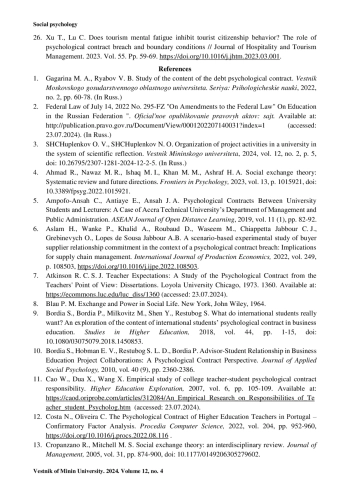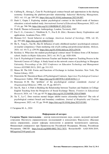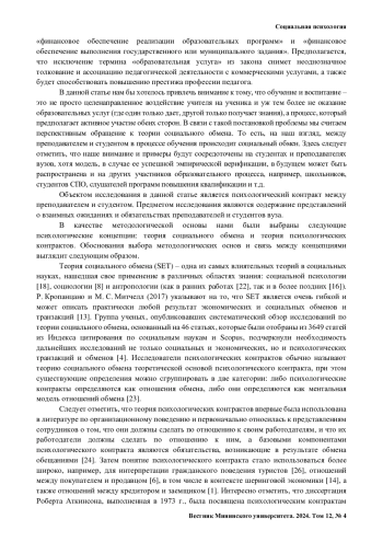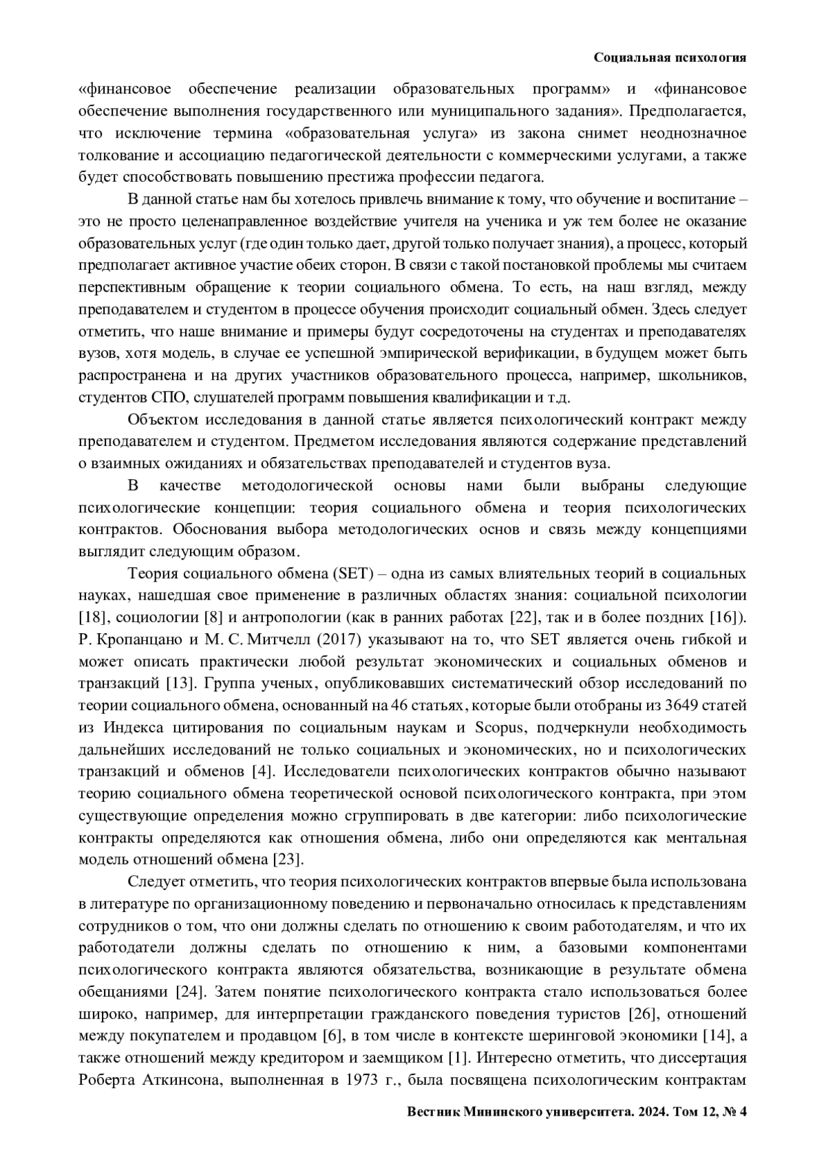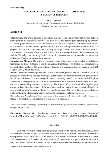 ГАГАРИНА М. А. ПСИХОЛОГИЧЕСКИЙ КОНТРАКТ МЕЖДУ ПРЕПОДАВАТЕЛЕМ И СТУДЕНТОМ: ОБЗОР ИССЛЕДОВАНИЙ // ВЕСТНИК МИНИНСКОГО УНИВЕРСИТЕТА. 2024. ТОМ 12, № 4