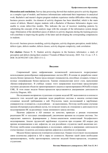 Введение. Успешное освоение методологии объектно ориентированного моделирования бизнес-процессов требует от обучающихся «Бизнес-информатики» значительных временных затрат и усилий в практической деятельности. Как студенты этой специальности воспринимают диаграммы деятельности языка UML? Почему созданные ими модели содержат дефекты, которые снижают качество диаграмм? Зависит ли количество дефектов модели от уровня образования ее автора? Может ли сложность моделей влиять на их качество? Цель исследования – найти ответы на эти актуальные вопросы, которые помогут скорректировать обучение бизнес-информатиков созданию диаграмм деятельности и направить его на развитие у них устойчивых профессиональных компетенций моделирования. Материалы и методы. Выполнен опрос обучающихся на дисциплинах объектно ориентированного анализа и проектирования о степени сложности восприятия диаграмм деятельности и перспектив их дальнейшего использования. Изучены ответы 363 респондентов. Педагогический эксперимент проведен на корпусе из 124 диаграмм деятельности, созданных студентами бакалавриата и магистратуры специальности «Бизнес-информатика» и близкой к ней. Выполнены классификация дефектов, поиск связи между количеством дефектов различных классов, а также между мерой сложности модели и количеством дефектов в ней. Использован статистический и корреляционный анализ, выполненный с помощью открытого программного обеспечения. Результаты исследования. Модели бизнес-процессов в целом не воспринимаются обучающимися как простые для создания и необходимые в практической деятельности. Однако будущие бизнес-аналитики планируют использовать их на практике в первую очередь. Не были подтверждены гипотезы о нормальности распределений выборок количества дефектов в моделях студентов бакалавриата и магистратуры, в том числе по классам дефектов, а также у выборок меры сложности этих диаграмм. Использована ранговая корреляция, которая показала существование статистической значимой положительной связи между количеством дефектов различных классов с учетом уровня образования авторов моделей, а также между количеством дефектов модели и ее сложностью. Обсуждение и заключения. Обработка данных опроса показала, что обучающиеся воспринимают диаграммы деятельности как непростой вид моделей, а бизнес-информатики понимают их важность в аналитической работе. Студенты бакалавриата и магистратуры испытывают похожие трудности при создании моделей бизнес-процессов. Выявлен элемент диаграмм деятельности, который является основным источником дефектов. Студенты магистратуры с образованием «Бакалавр бизнес-информатики» не смогли создать бездефектные модели, что свидетельствует о применении неверных шаблонов моделирования путем подмены понятий этапа анализа понятиями этапа проектирования информационной системы. Устранение в процессе обучения выявленных причин дефектов в диаграммах деятельности будет способствовать повышению качества последних и формированию соответствующих компетенций у студентов.