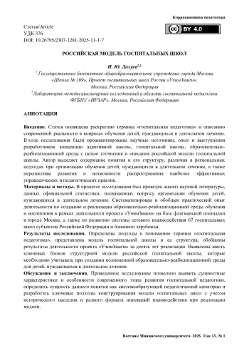 Обсуждение и заключения. Проведенное исследование позволило выявить сущностные характеристики и особенности современного этапа развития госпитальной педагогики, определить сущность данного понятия как системообразующей педагогической категории и разработать ключевые подходы конструирования модели госпитальных школ с учетом исторического наследия и разного формата инноваций взаимодействия при реализации модели.