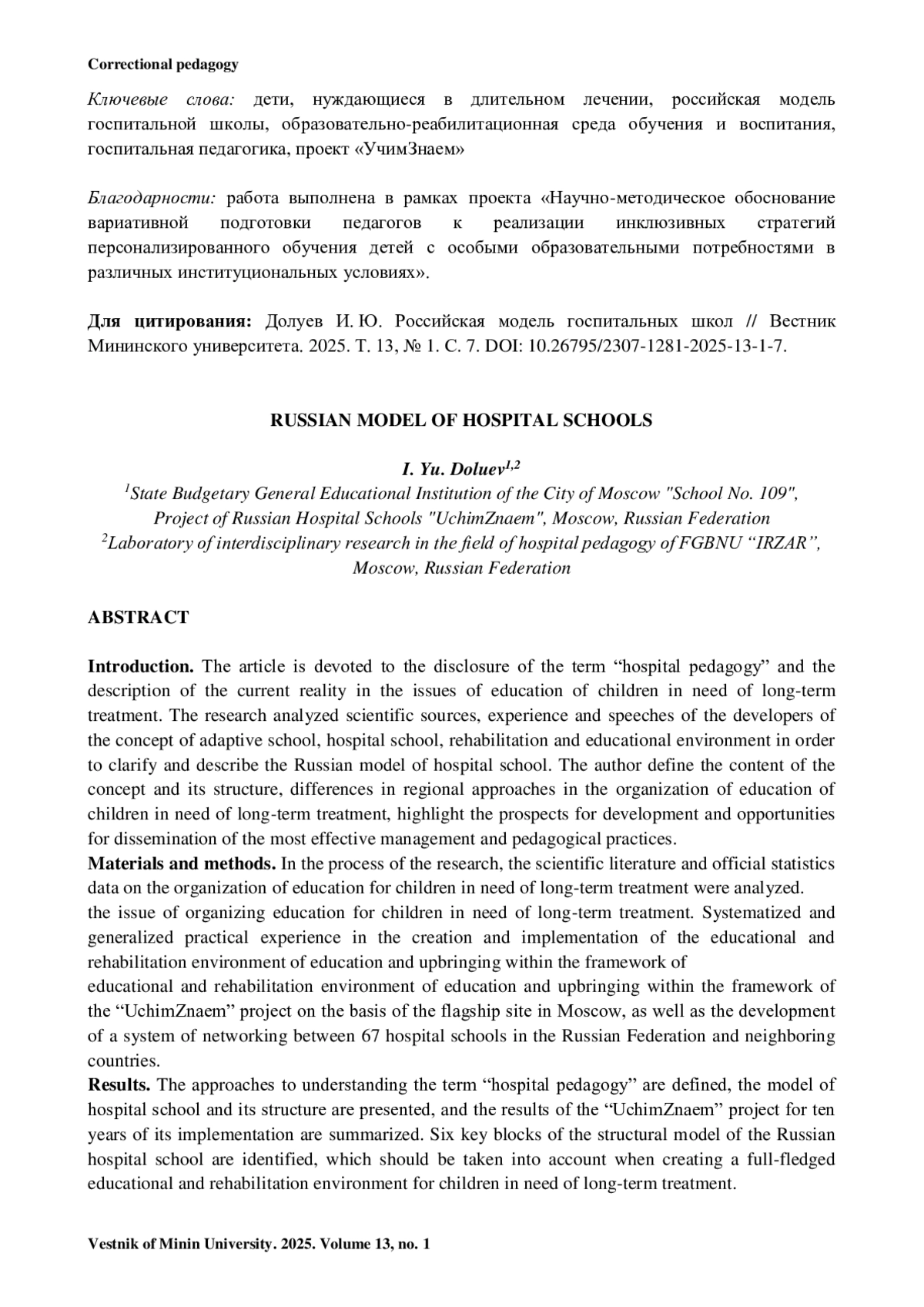 Результаты исследования. Определены подходы к пониманию термина «госпитальная педагогика», представлена модель госпитальной школы и ее структура, обобщены результаты деятельности проекта «УчимЗнаем» за десять лет реализации. Выявлены шесть ключевых блоков структурной модели российской госпитальной школы, которые необходимо учитывать при создании полноценной образовательно-реабилитационной среды для детей, нуждающихся в длительном лечении.