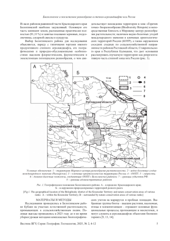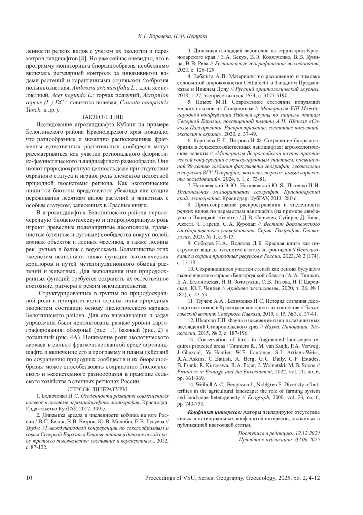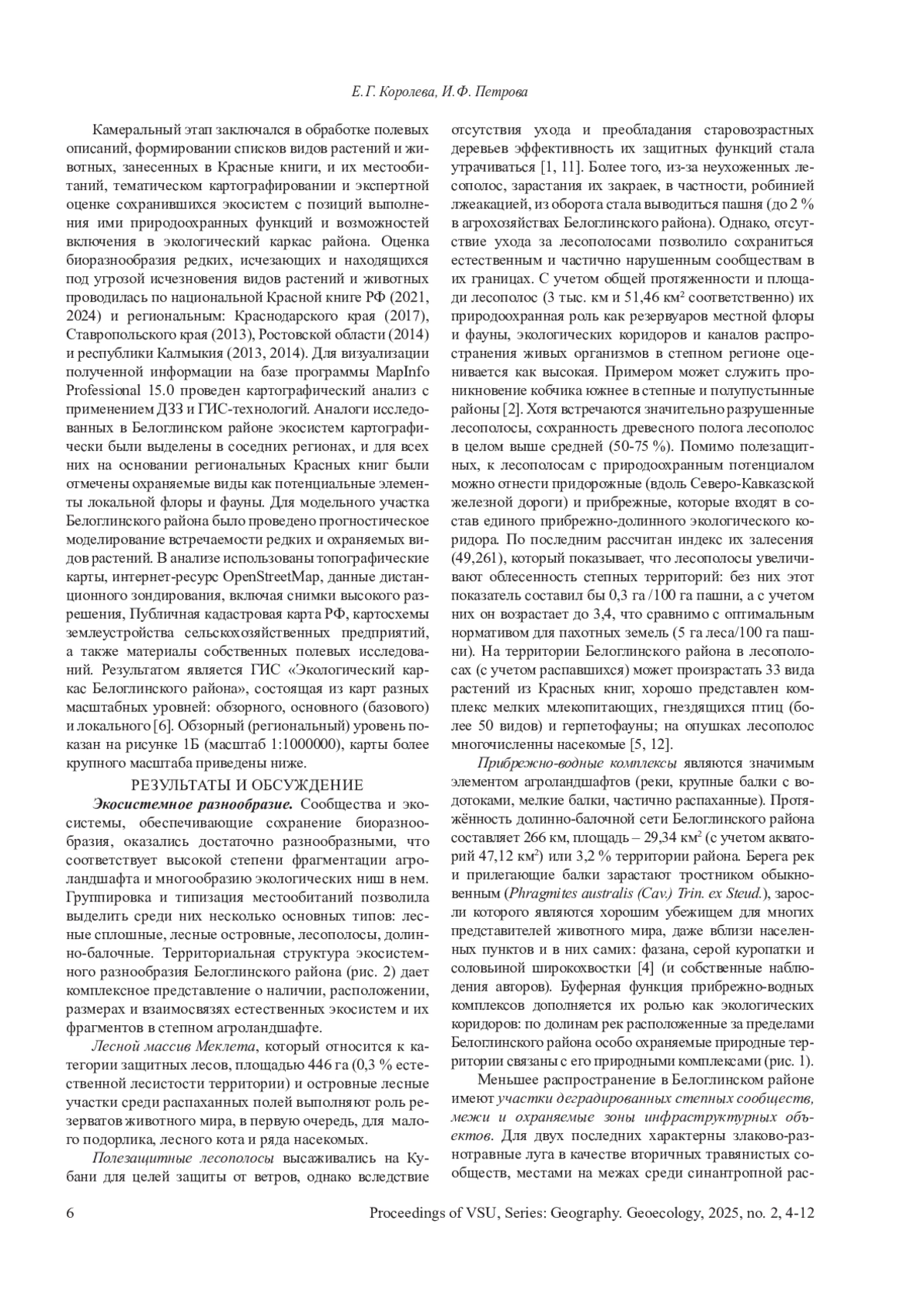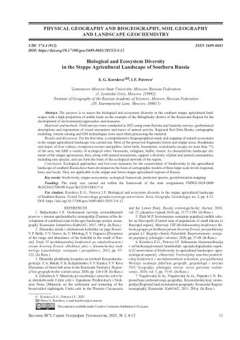 ПЕТРОВА И.Ф., КОРОЛЕВА Е. Г. БИОЛОГИЧЕСКОЕ И ЭКОСИСТЕМНОЕ РАЗНООБРАЗИЕ В СТЕПНОМ АГРОЛАНДШАФТЕ ЮГА РОССИИ // ВЕСТНИК ВОРОНЕЖСКОГО ГОСУДАРСТВЕННОГО УНИВЕРСИТЕТА. СЕРИЯ: ГЕОГРАФИЯ. ГЕОЭКОЛОГИЯ. 2025. № 2