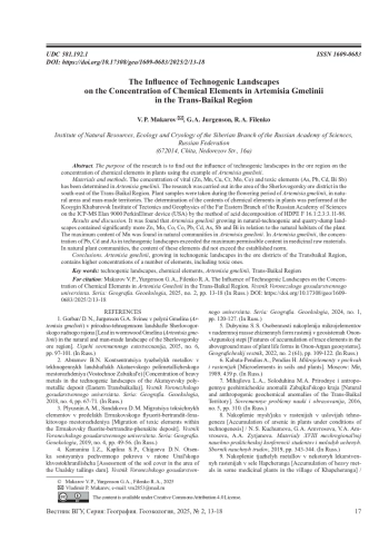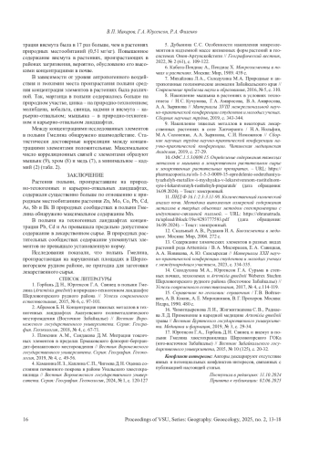 5. Дубынина С. С. Особенности накопления микроэлементов в надземной массе жизненных форм растений в геосистемах Онон-Аргунскойстепи // Географический вестник, 2022, № 2 (61), с. 109-122. EDN: ZESQDI