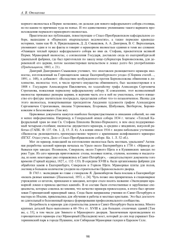 Пермский Спасо-Преображенский кафедральный собор имеет более чем 200-летнюю историю. Он часто и много перестраивался, расширялся, добавлялись приделы. Изначально собор делился на два храма: летний и зимний. В летнем был установлен сохранившийся до наших дней барочный деревянный иконостас, привезенный из Пыскорского ставропигиального монастыря; второй иконостас в зимнем, Стефановском, храме был выполнен из мрамора. Он был разобран после передачи здания собора в 1931 г. для нужд Пермской художественной галереи. По проекту архитектора Н. А. Шварёва была сделана внутренняя реконструкция, необходимая для размещения художественного музея. О том, что представлял собой мраморный иконостас, писали очень кратко в дореволюционных изданиях. Упоминалось, что он был сделан по заказу вице-губернатора И. М. Борноволокова на Горнощитском мраморном заводе. Говорилось также о размещенных в нем иконах кисти художников Императорской академии художеств, дарованных А. С. Строгановым. Однако знаний в деталях о том, кто был автором, мастером иконостаса, из каких точно видов мрамора и в какие сроки он был сделан, как доставлен в Пермь, на данный момент не сохранилось. В публикуемой статье предпринимается попытка реконструировать историю создания мраморного иконостаса, обосновать авторство его создателя, дать общую характеристику объекта и доказать его уникальность. Большинство документов, использованных в публикации, в том числе и фотографии, вводятся в научный оборот впервые.