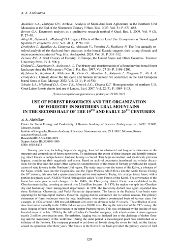 34. Aleinikov A.A., Lisitsyna O.V. Archival Analysis of Slash-And-Burn Agriculture in the Northern Ural Mountains at the End of the Nineteenth Century // Hum. Ecol. 2023. Vol. 51. P. 671-683. EDN: HMBCGH