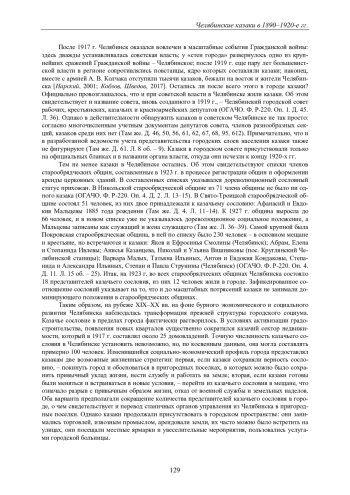 Рассматривается проблематика, связанная с жизнью казаков в городском пространстве. В историографии казаки стереотипно воспринимаются исключительно как сельские жители, селившиеся в станицах и поселках, поэтому малоизученной остается проблематика, связанная с жизнью казаков в городском пространстве. С момента основания Челябинска в 1736 г. казаки были частью городского населения. Они несли военную службу, имели специфические права и обязанности, но также были включены в городской социум: участвовали в самоуправлении и экономической жизни. Центральный вопрос данной статьи - изменение численности казачьего населения в Челябинске в конце XIX - первые десятилетия XX в. Для решения задачи потребовалось привлечение обширного круга разнообразных архивных источников: клировых ведомостей городских приходов, раскладочных ведомостей налога на недвижимое имущество, реестров выдачи промысловых свидетельств, списков избирателей, переписки городской управы, делопроизводственных документов городского совета. В результате проведенного исследования установлено, что на рубеже XIX-XX вв. казачье сословие в пределах города фактически растворилось: численность сократилась примерно до ста человек, казачий сектор недвижимости - до 25 домовладений. Выявлены две возможные жизненные стратегии в новых условиях: первая - покинуть город и обосноваться в пригородных поселках; вторая - перейти из казачьего сословия в мещане. Оба варианта предполагали сокращение количества представителей казачьего сословия в городе, о чем свидетельствует и перевод станичных органов управления из Челябинска в пригородные поселки. Номинальное включение казаков в городской совет в 1919 г. скорее указывало на попытку привлечь на свою сторону оппозиционно настроенное казачество, а также на позиционирование Челябинска как места проживания казаков.