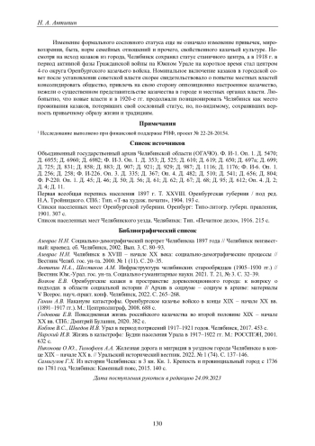 4. Волков Е.В. Оренбургские казаки в пространстве дореволюционного города: к вопросу о подходах в области социальной истории // Архив в социуме - социум в архиве: материалы V Всерос. науч.-практ. конф. Челябинск, 2022. С. 265-268. EDN: BEMRHG