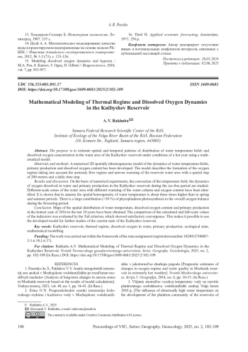 2. Даценко Ю. С., Пуклаков В. В. Анализ многолетних изменений зон аноксии в Можайском водохранилище по результатам модельных расчетов // Водные ресурсы, 2021, т. 48, № 1, с. 34-41. EDN: WGJTZD