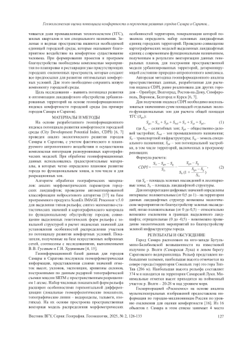 Статья: ГЕОЭКОЛОГИЧЕСКАЯ ОЦЕНКА ПОТЕНЦИАЛА КОМФОРТНОСТИ И ПЕРСПЕКТИВ РАЗВИТИЯ ГОРОДОВ САМАРА И САРАТОВ ГЕОИНФОРМАЦИОННЫМИ МЕТОДАМИ (2025)