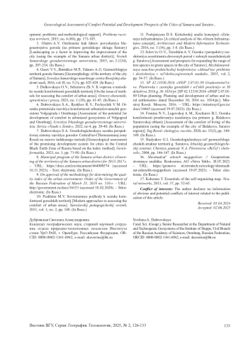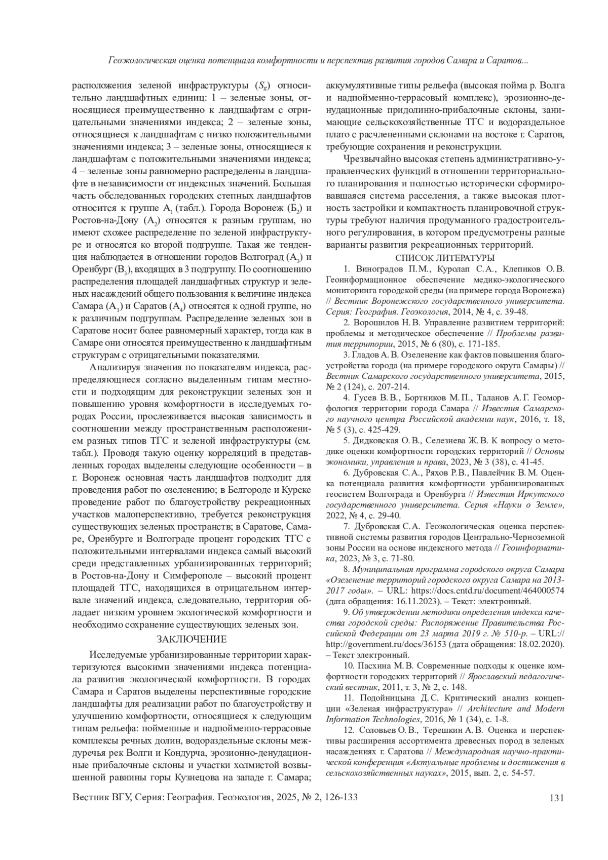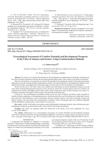 ДУБРОВСКАЯ С. А. ГЕОЭКОЛОГИЧЕСКАЯ ОЦЕНКА ПОТЕНЦИАЛА КОМФОРТНОСТИ И ПЕРСПЕКТИВ РАЗВИТИЯ ГОРОДОВ САМАРА И САРАТОВ ГЕОИНФОРМАЦИОННЫМИ МЕТОДАМИ // ВЕСТНИК ВОРОНЕЖСКОГО ГОСУДАРСТВЕННОГО УНИВЕРСИТЕТА. СЕРИЯ: ГЕОГРАФИЯ. ГЕОЭКОЛОГИЯ. 2025. № 2