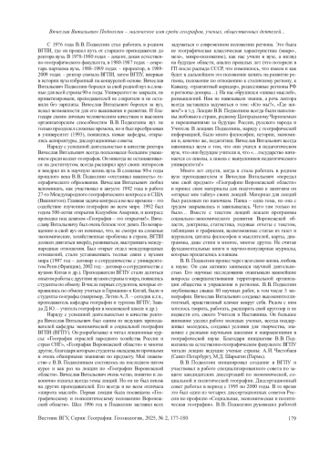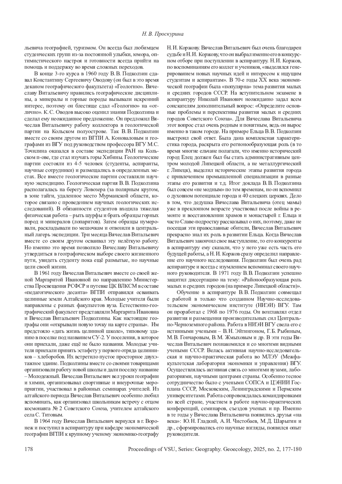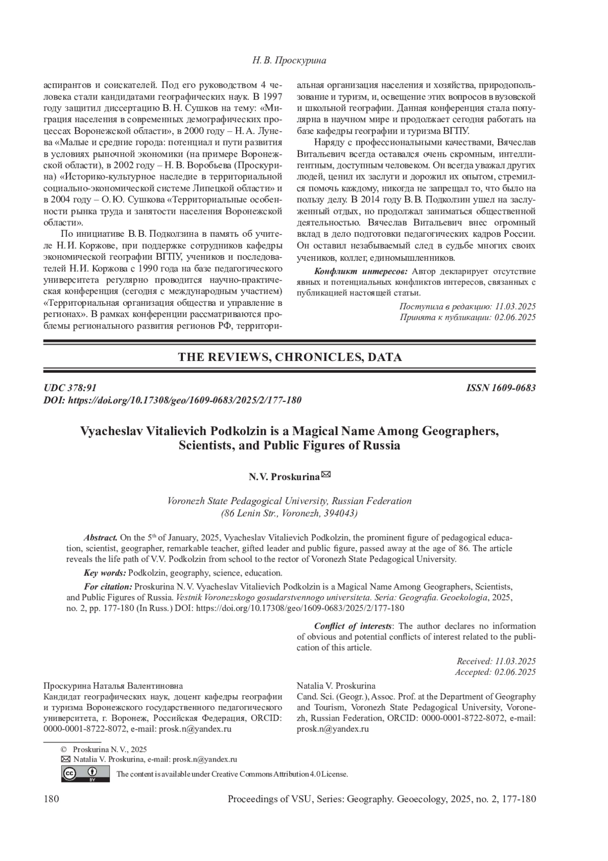 ПРОСКУРИНА Н. В. ВЯЧЕСЛАВ ВИТАЛЬЕВИЧ ПОДКОЛЗИН - МАГИЧЕСКОЕ ИМЯ СРЕДИ ГЕОГРАФОВ, УЧЕНЫХ, ОБЩЕСТВЕННЫХ ДЕЯТЕЛЕЙ РОССИИ // ВЕСТНИК ВОРОНЕЖСКОГО ГОСУДАРСТВЕННОГО УНИВЕРСИТЕТА. СЕРИЯ: ГЕОГРАФИЯ. ГЕОЭКОЛОГИЯ. 2025. № 2