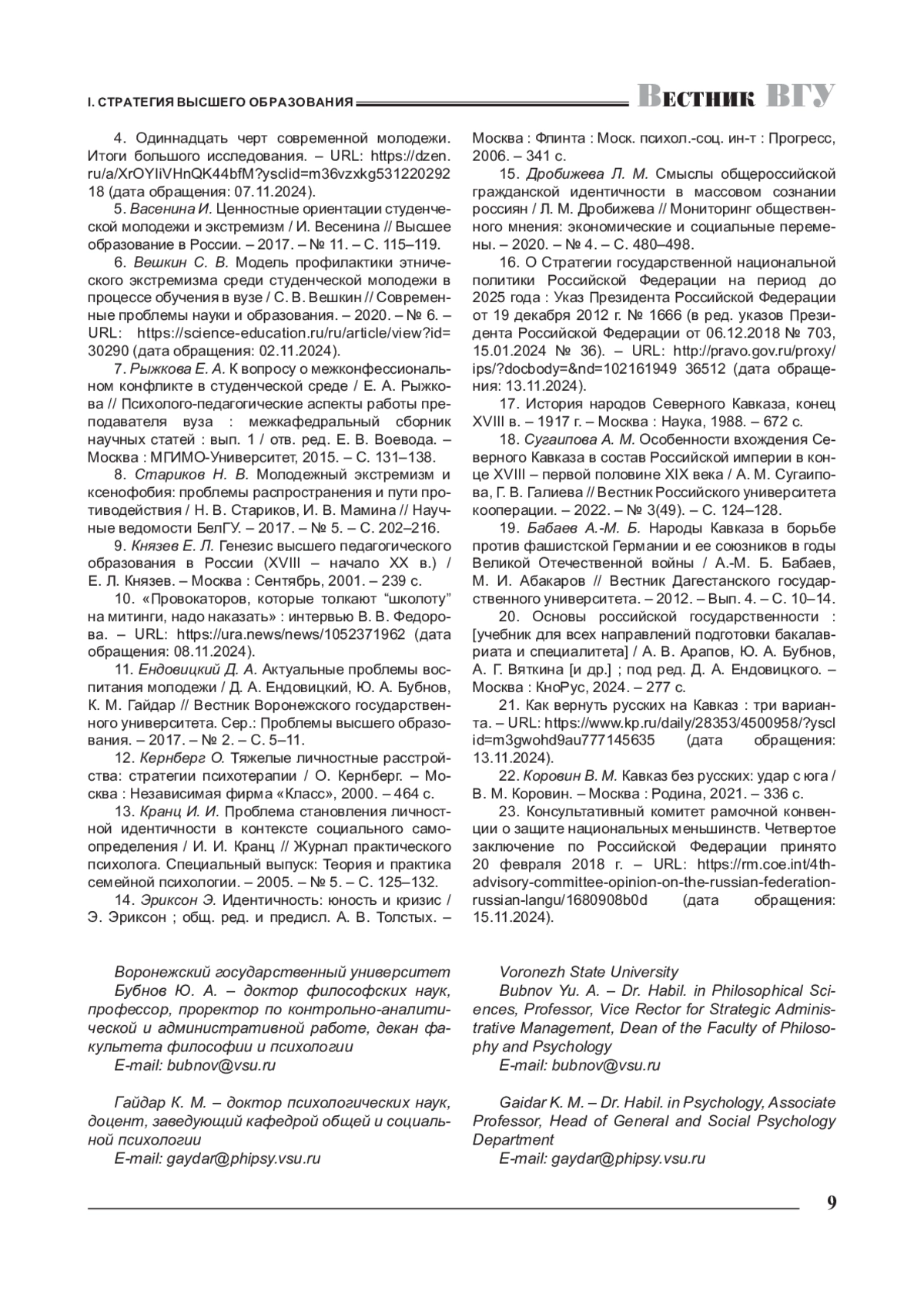 11. Ендовицкий Д. А. Актуальные проблемы воспитания молодежи / Д. А. Ендовицкий, Ю. А. Бубнов, К. М. Гайдар // Вестник Воронежского государственного университета. Сер.: Проблемы высшего образования. - 2017. -№ 2. - С. 5-11.