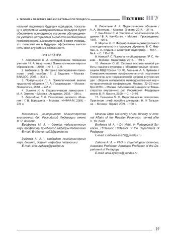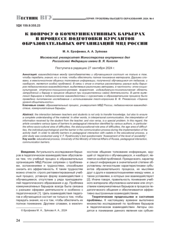 ЕРОФЕЕВА М. А., ЗУЙКОВА А. А. К ВОПРОСУ О КОММУНИКАТИВНЫХ БАРЬЕРАХ В ПРОЦЕССЕ ПОДГОТОВКИ КУРСАНТОВ ОБРАЗОВАТЕЛЬНЫХ ОРГАНИЗАЦИЙ МВД РОССИИ // ВЕСТНИК ВОРОНЕЖСКОГО ГОСУДАРСТВЕННОГО УНИВЕРСИТЕТА. СЕРИЯ: ПРОБЛЕМЫ ВЫСШЕГО ОБРАЗОВАНИЯ. 2024. № 4