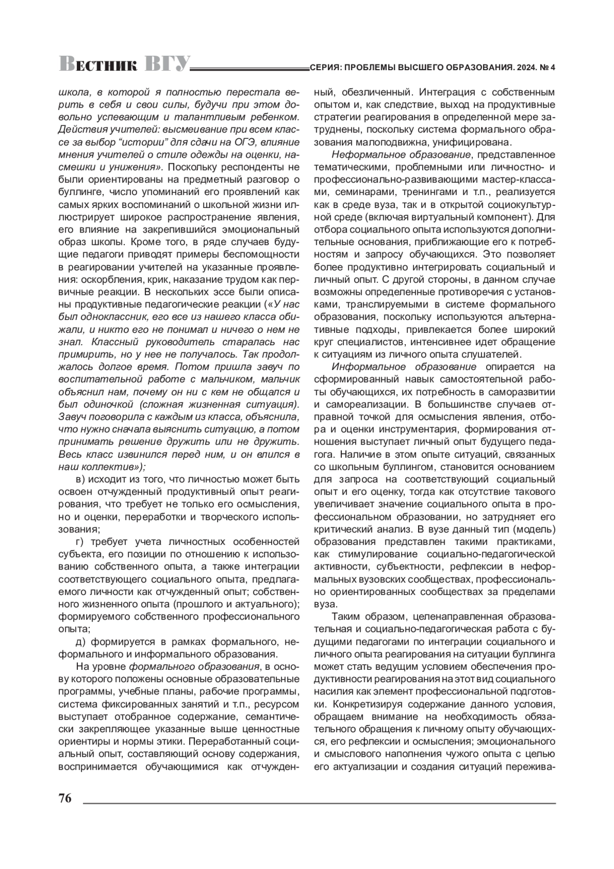 В статье затрагивается вопрос о подготовке будущих педагогов к работе с буллингом в различных его проявлениях. Обращается внимание на важность личностных детерминант готовности, включая варианты предшествующего опыта. Автор описывает особенности процесса формирования опыта продуктивного реагирования у будущих педагогов на явления профессиональной практики, происходящего на уровнях формального, неформального и информального образования с опорой на различные виды опыта обучающихся, его рефлексию и осмысление, эмоциональное и смысловое наполнение чужого опыта с целью его актуализации и создания ситуаций переживания. В статье представлен результат анализа эссе, выполненных студентами Воронежского государственного педагогического университета.