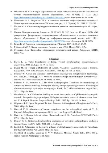 19. Обухова Н. И. VUCA-мир и образовательная среда // Научно-методический электронный журнал «Калининградский вестник образования». 2021. № 3 (11). С. 11-22. URL: https://koirojournal.ru/realises/g2021/30sent2021/kvo302 (дата обращения: 10.01.2025).