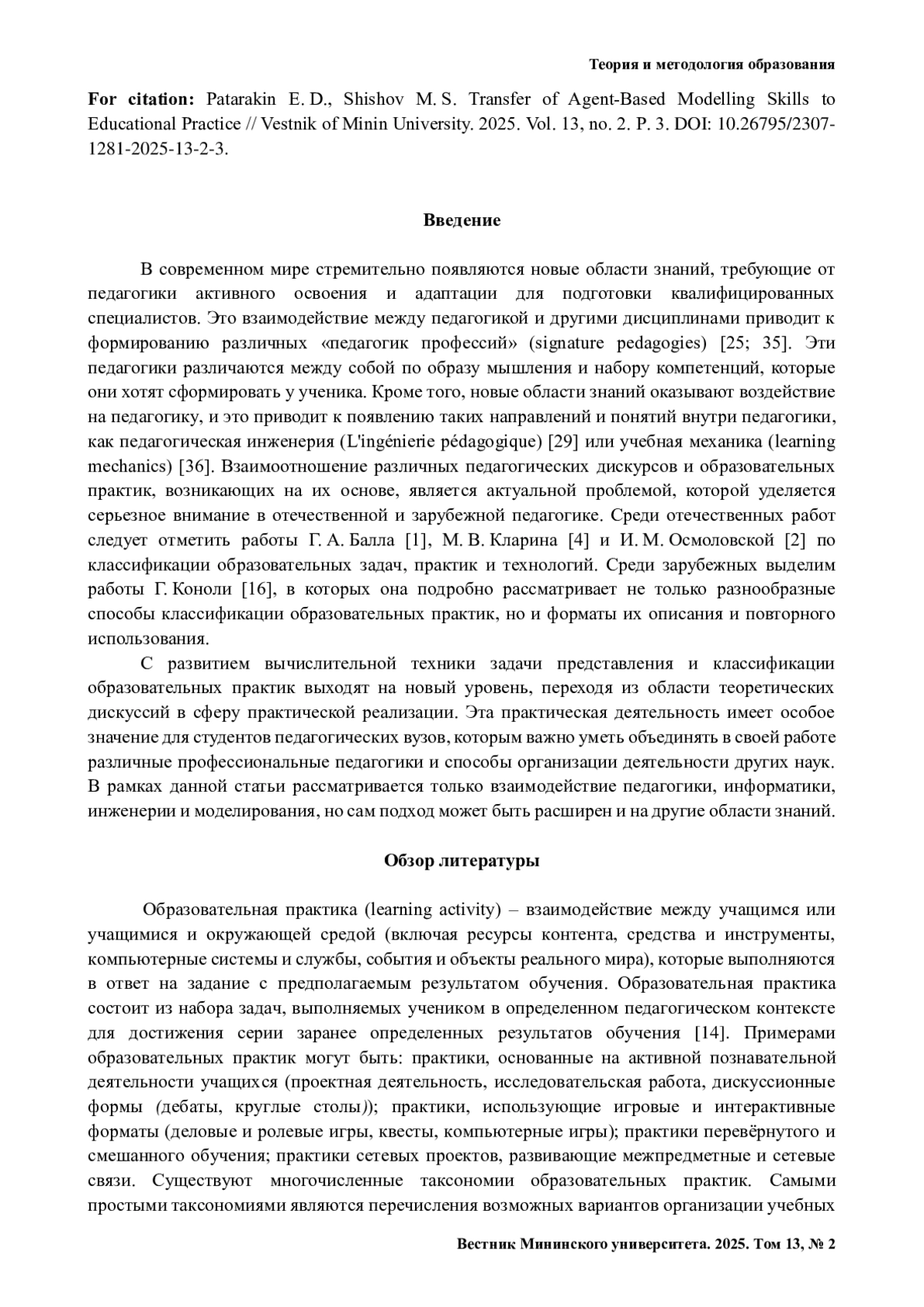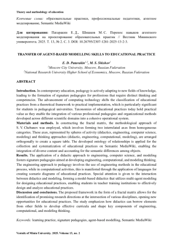 Результаты исследования. Применение дидактического подхода к инженерии, информатике и моделированию формирует профессиональные педагогики, нацеленные на развитие инженерного, вычислительного и модельного мышления. Инженерный подход к педагогике предполагает использование инженерных методов в образовательном процессе, а в вычислительной деятельности это проявляется в применении языков для создания диаграмм сценариев образовательных практик. Особое внимание уделяется взаимодействию дидактики и моделирования, формируя модельную дидактику, использующую многоагентное моделирование для проектирования образовательных практик, что позволяет студентам педагогических вузов эффективно проектировать и анализировать образовательные практики.