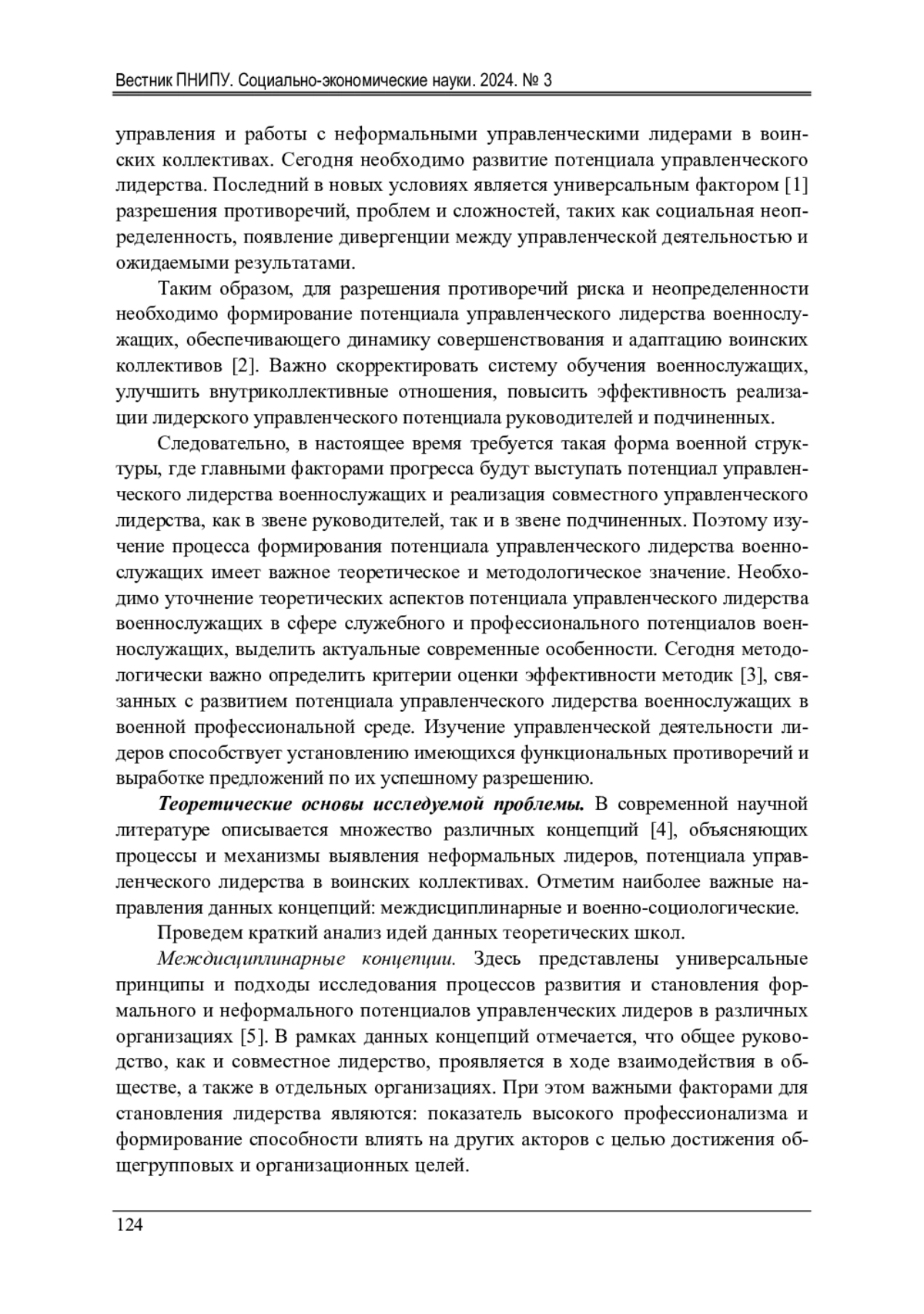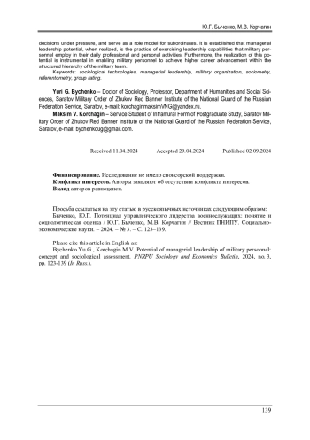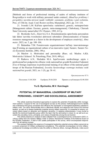 БЫЧЕНКО Ю. Г., КОРЧАГИН М. В. ПОТЕНЦИАЛ УПРАВЛЕНЧЕСКОГО ЛИДЕРСТВА ВОЕННОСЛУЖАЩИХ: ПОНЯТИЕ И СОЦИОЛОГИЧЕСКАЯ ОЦЕНКА // ВЕСТНИК ПЕРМСКОГО НАЦИОНАЛЬНОГО ИССЛЕДОВАТЕЛЬСКОГО ПОЛИТЕХНИЧЕСКОГО УНИВЕРСИТЕТА. СОЦИАЛЬНО-ЭКОНОМИЧЕСКИЕ НАУКИ. 2024. № 3