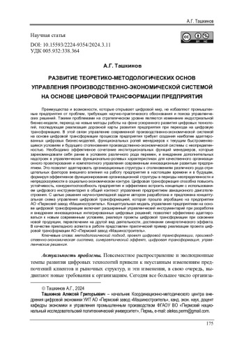 27. Ташкинов, А.Г. Разработка концепции управления развитием производственно-экономической системы предприятия / А.Г. Ташкинов // Вестник Пермского национального исследовательского политехнического университета. Социально-экономические науки. - 2023. - № 4. - С. 209-221. EDN: TUSGPS