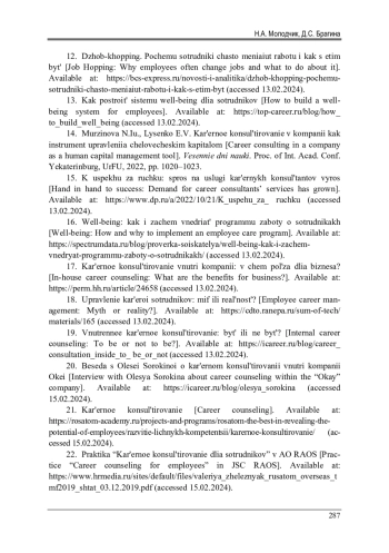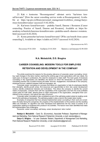 МОЛОДЧИК Н. А., БРАГИНА Д. С. КАРЬЕРНОЕ КОНСУЛЬТИРОВАНИЕ: СОВРЕМЕННЫЕ ИНСТРУМЕНТЫ УДЕРЖАНИЯ И РАЗВИТИЯ СОТРУДНИКОВ В КОМПАНИИ // ВЕСТНИК ПЕРМСКОГО НАЦИОНАЛЬНОГО ИССЛЕДОВАТЕЛЬСКОГО ПОЛИТЕХНИЧЕСКОГО УНИВЕРСИТЕТА. СОЦИАЛЬНО-ЭКОНОМИЧЕСКИЕ НАУКИ. 2024. № 3