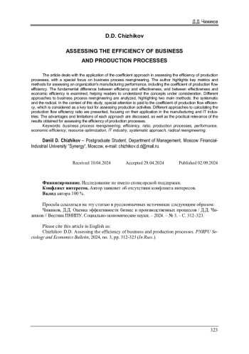 Представлено исследование применения коэффициентного подхода в оценке эффективности производственных процессов с особым акцентом на реинжиниринг бизнес-процессов. Описываются ключевые метрики оценки производственных процессов организации, включая коэффициент эффективности потока производства. Рассматривается фундаментальная разница между результативностью и эффективностью, а также между эффективностью и экономической эффективностью, что помогает понять суть рассматриваемых понятий. Проведен анализ различных подходов к реинжинирингу бизнес-процессов, выделяя два основных метода: систематический и радикальный. В контексте этого исследования особое внимание уделяется коэффициенту эффективности потока, который рассматривается как ключевой инструмент оценки производственной деятельности. Представлены различные подходы к расчету коэффициента эффективности потока производства, с акцентом на их применение в производственной и ИТ-отраслях. Обсуждаются преимущества и ограничения каждого из подходов, а также практическая значимость получаемых результатов для проведения оценочных работ касательно эффективности производственных процессов.