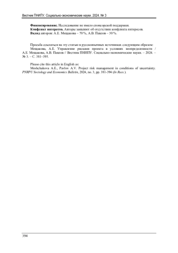 МЕЩАКОВА А. Е., ПАВЛОВ А. В. УПРАВЛЕНИЕ РИСКАМИ ПРОЕКТА В УСЛОВИЯХ НЕОПРЕДЕЛЕННОСТИ // ВЕСТНИК ПЕРМСКОГО НАЦИОНАЛЬНОГО ИССЛЕДОВАТЕЛЬСКОГО ПОЛИТЕХНИЧЕСКОГО УНИВЕРСИТЕТА. СОЦИАЛЬНО-ЭКОНОМИЧЕСКИЕ НАУКИ. 2024. № 3