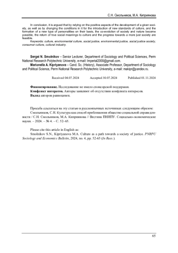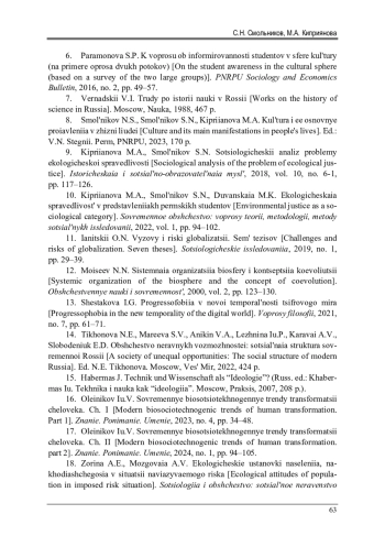 10. Киприянова, М.А. Экологическая справедливость в представлениях пермских студентов / М.А. Киприянова, С.Н. Смольников, М.К. Дуванская // Современное общество: вопросы теории, методологии, методы социальных исследований. - 2022. - Т. 1. - С. 94-102. EDN: LRFOCE