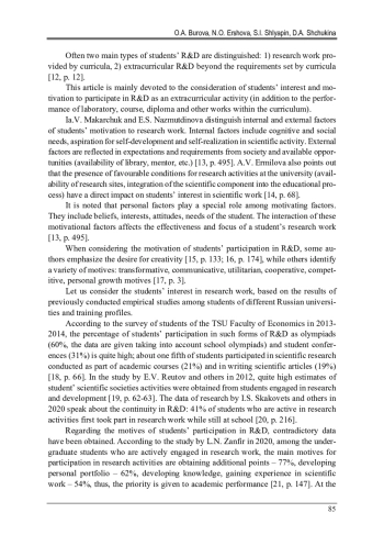 The labour market values specialists with deep professional knowledge, who are able to think creatively, innovatively and forward-looking. Through research work (or R&D – research and development) students develop a scientific approach, flexibility of thinking, gain useful experience and a portfolio for further employment. However, there are questions regarding the effectiveness of student science organization, as many students are not motivated to participate in research activities for various reasons [1, p. 38]. In recent years, Russian universities have been experiencing a decline in the number of young scientists.