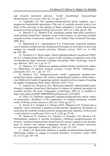 10. Botataeva U.A., Ospanova Zh.A., Turysbekova G.Zh. Nauchno-issledovatel’skaia rabota studentov kak sostavliaiushchaia edinogo uchebnogo i nauchno-innovatsionnogo protsessa v vuze [Research work students as one component training and research innovation process]. Vestnik Kazakhskogo Natsional’nogo Meditsinskogo Universiteta, 2014, no. 3-2, pp. 22-25.