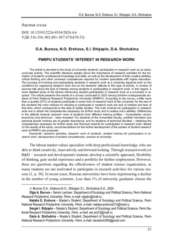 Статья посвящена изучению участия студентов вузов в научно-исследовательской работе как внеучебной деятельности (сверх учебного плана). В научной литературе говорится о важности научно-исследовательской деятельности для формирования профессиональных знаний, умений и навыков студентов, а также развития их творческих способностей, критического мышления и других универсальных компетенций, необходимых современному специалисту с высшим образованием. Успешность вовлечения и участия студентов в научно-исследовательской работе в вузе зависит как от условий организации НИРС, так и от отношения самих студентов к этому виду деятельности. В ряде источников говорится о недостаточной заинтересованности студентов в участии в НИР. В связи с этим требуется более подробное изучение факторов, влияющих на участие студентов в научно-исследовательской работе в вузе. В статье представлены результаты опроса, проведенного в 2023 г. среди студентов бакалавриата дневного отделения Пермского национального исследовательского политехнического университета (ПНИПУ). По результатам опроса, немногим более четверти (27 %) студентов участвуют в тех или иных формах НИР в вузе, для остальных студентов основными мотивами отказа от участия в НИР являются отсутствие интереса и отсутствие свободного времени, что соответствует данным ранее проведенных исследований. Основными мотивами участия в НИР являются получение компетенций, необходимых для дальнейшей учебы, и реализация своих способностей. Выявлены различия в отношении к НИР студентов разных профилей обучения - гуманитарного (социально-экономического) и технического. Для студентов гуманитарного факультета большее значение имеют формирование портфолио и мотивы личностного роста, а для студентов технических факультетов - получение компетенций, необходимых для дальнейшей учебы, и материальное вознаграждение за участие в НИР. На основе результатов исследования предложены рекомендации по дальнейшему развитию системы научно-исследовательской работы студентов в ПНИПУ.