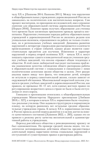 Статья посвящена изучению нарушений дисциплины и порядка в общеобразовательных средних учебных заведениях Российской империи на рубеже XIX–XX вв. В основе лежит изучение материалов циркулярных предписаний Министерства Народного просвещения с применением самых крайних мер лишения права на обучение в образовательных учреждениях страны. Проанализированы количественный и качественный состав нарушений, их динамика развития и взаимосвязь этого процесса с общеисторическими процессами в российском обществе в указанный период. Сделаны выводы о нарастании революционного кризиса в обществе на примере образовательной системы в определенных временных рамках, иллюстрирующих развитие социального кризиса в России в начале ХХ в. Рассмотрены пропорции политических, административных и уголовных преступлений в средних образовательных учреждениях страны. В статье сделаны наблюдения о религиозном, национальном и половом составе нарушителей в средних учебных заведениях на рубеже веков и указаны некоторые меры правительства по нормализации ситуации в обществе.