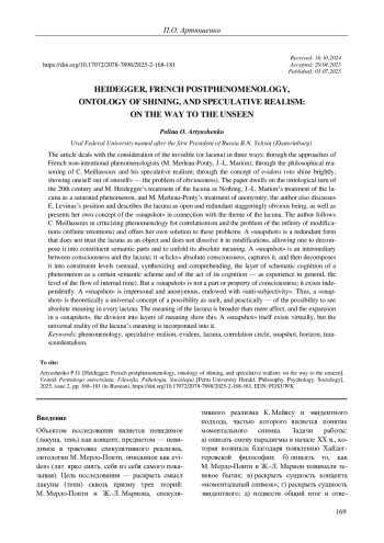 Статья посвящена рассмотрению невидимого (или лакуны) тремя способами: через подходы французских неинтенциональных феноменологов (М. Мерло-Понти, Ж.-Л. Марион), через философские рассуждения К. Мейясу и его спекулятивный реализм, а также через понятие evidens («ярко сиять, себя из себя самого показывая» - проблема очевидности). Автор останавливается на онтологическом повороте XX в. и трактовках лакуны как Ничто у М. Хайдеггера, лакуны как насыщенного феномена у Ж.-Л. Мариона и анонимности у М. Мерло-Понти, говорит о позиции Э. Левинаса, а также описывает лакуну как открытое и избыточное ошеломительно очевидное бытие, презентует собственную концепцию «моментального снимка» в связи с темой лакуны. Автор идет за К. Мейясу и критикует феноменологию за корреляционизм и проблему бесконечности модификаций (бесконечных ретенций) и предлагает свое решение этих проблем. «Снимок» - это избыточная форма, не относящаяся к лакуне как к предмету и не растворяющая его в модификациях, позволяющая разложить ее на составляющие смысловые части и развернуть абсолютный смысл лакуны. «Снимок» - посредник между сознанием и лакуной: «щелкает» абсолютное сознание, оно же фиксирует, а затем раскладывает на составляющие уровни (чувственный, синтезирующий и осмысляющий слой схематического познания феномена как некой смысловой схемы, а акта его познания - как переживания вообще, уровень течения внутреннего времени). Но «снимок» не является частью или собственностью сознания, он существует самостоятельно. «Снимок» безличен и анонимен, наделен «антисубъектностью». Таким образом, «снимок» теоретически есть универсальный концепт возможности как таковой, а практически - возможности в каждой лакуне увидеть абсолютный смысл. Смысл лакуны шире, чем просто аффект, и расширение в «снимке», разделение на слои смысла, показывает это. В конце концов сам «снимок» существует виртуально, но в нем зашита универсальная реальность смысла лакуны.