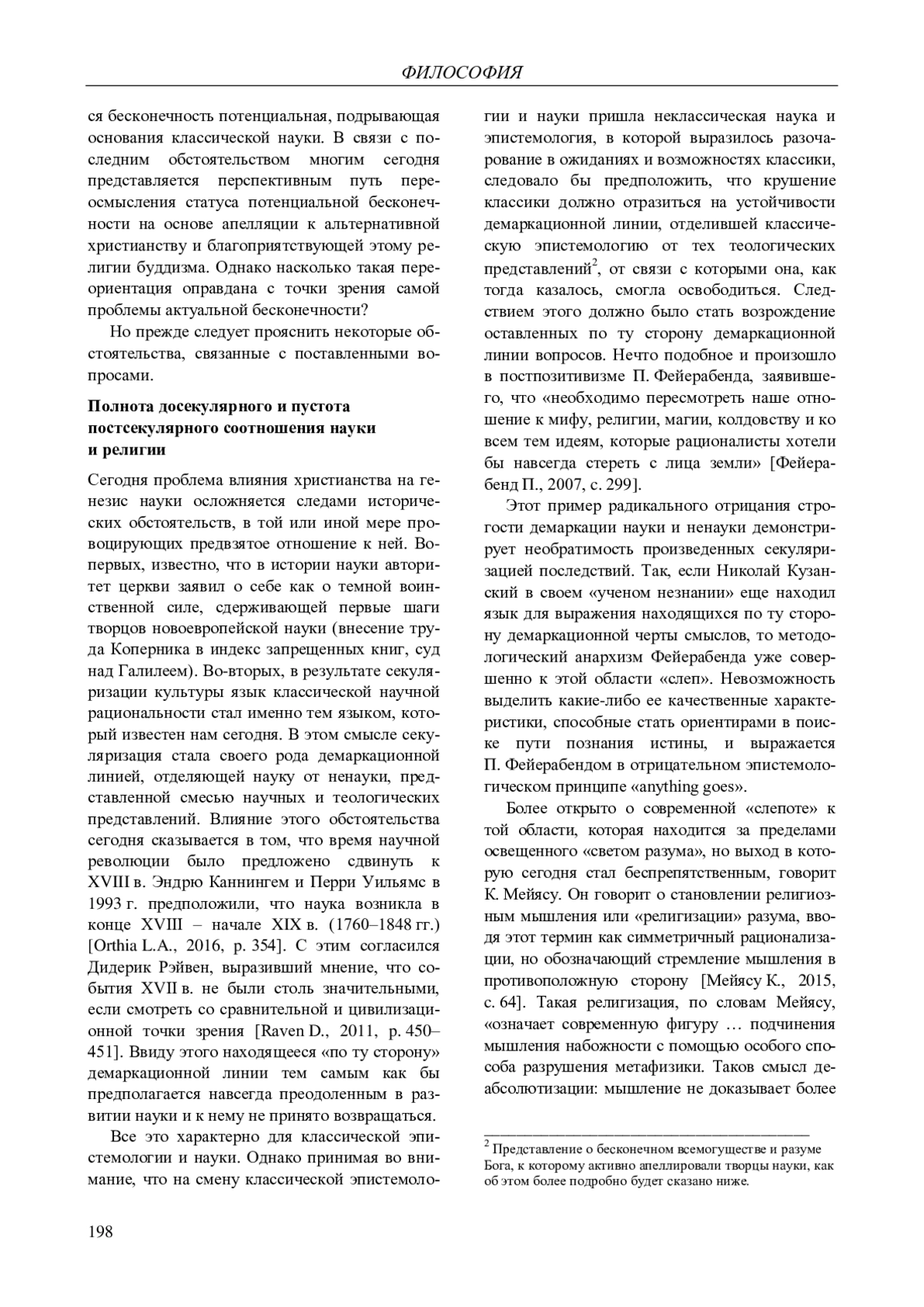 В статье показано, что проблемой бесконечности задается развитие соотношения науки и религии. В классический период эта проблема была представлена отношением науки и христианства. Именно благодаря идеи христианского Бога в европейской интеллектуальной культуре впервые произошла легализация актуальной бесконечности. Попытки основателей новоевропейской науки найти положительное понимание актуальной бесконечности в пределах только человеческого разума должны были стать тем самым решающим революционным шагом, который в истории генезиса науки так и остался несостоявшимся, в связи с чем сегодня предлагают пересмотреть саму концепцию научной революции XVII в. Крушение классики ознаменовалось тем, что вместо актуальной бесконечности заявила о себе бесконечность потенциальная, которая и стала парадигмальным ядром неклассической эпистемологии, а также основанием для установления параллелей с эпистемологией и онтологией буддизма. Последнее выглядит перспективным и обнадеживающим ресурсом, поскольку оправдывает проблематичные с точки зрения классики представления неклассической эпистемологии апелляцией к древневосточной мудрости как традиции более древней, чем христианство. В статье показано, что несмотря на это, для западноевропейской традиции характерны преимущественные позиции в интерпретации и оценке особенностей эпистемологической неклассики, т. к. именно западноевропейской традиции доступна полнота видения проблемы актуальной бесконечности, включающей потенциальную бесконечность в качестве нежелательного следствия своего развития.