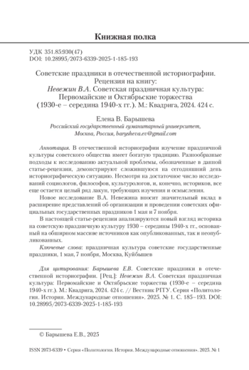 В настоящей статье-рецензии анализируются новый взгляд историка на советскую праздничную культуру 1930 – середины 1940-х гг., основанный на обширном массиве источников как опубликованных, так и неопубликованных.