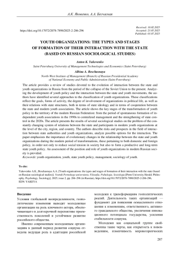Статья: МОЛОДЕЖНЫЕ ОРГАНИЗАЦИИ: ТИПЫ И ЭТАПЫ ФОРМИРОВАНИЯ ВЗАИМОДЕЙСТВИЯ С ГОСУДАРСТВОМ (ПО МАТЕРИАЛАМ РОССИЙСКИХ СОЦИОЛОГИЧЕСКИХ ИССЛЕДОВАНИЙ) (2025)