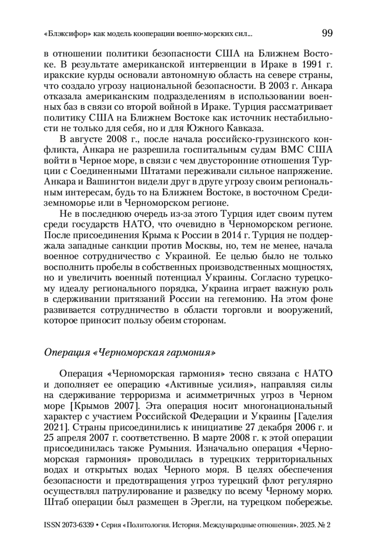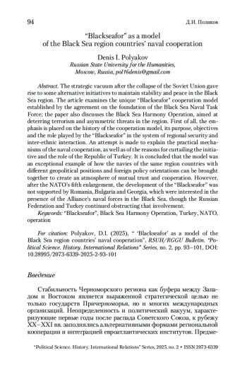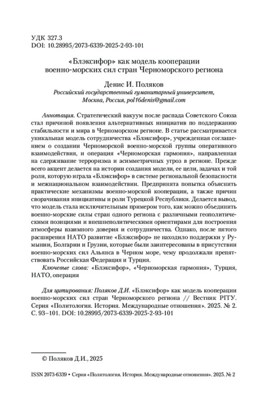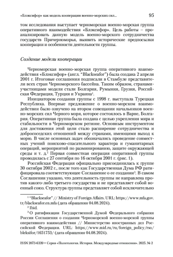 Стратегический вакуум после распада Советского Союза стал причиной появления альтернативных инициатив по поддержанию стабильности и мира в Черноморском регионе. В статье рассматривается уникальная модель сотрудничества «Блэксифор», учрежденная соглашением о создании Черноморской военно-морской группы оперативного взаимодействия, и операция «Черноморская гармония», направленная на сдерживание терроризма и асимметричных угроз в регионе. Прежде всего акцент делается на истории создания модели, ее цели, задачах и той роли, которую играла «Блэксифор» в системе региональной безопасности и межнациональном взаимодействии. Предпринята попытка объяснить практические механизмы военно-морской кооперации, а также причин сворачивания инициативы и роли Турецкой Республики. Делается вывод, что модель стала исключительным примером того, как можно объединить военно-морские силы стран одного региона с различными геополитическими позициями и внешнеполитическими ориентирами для построения атмосферы взаимного доверия и сотрудничества. Однако, после пятого расширения НАТО развитие «Блэксифор» не находило поддержки у Румынии, Болгарии и Грузии, которые были заинтересованы в присутствии военно-морских сил Альянса в Черном море, чему продолжали препятствовать Российская Федерация и Турция.