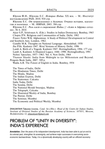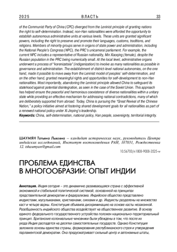 ШАУМЯН Т. Л. ПРОБЛЕМА ЕДИНСТВА В МНОГООБРАЗИИ: ОПЫТ ИНДИИ // ВЛАСТЬ. 2025. ТОМ 33 № S1