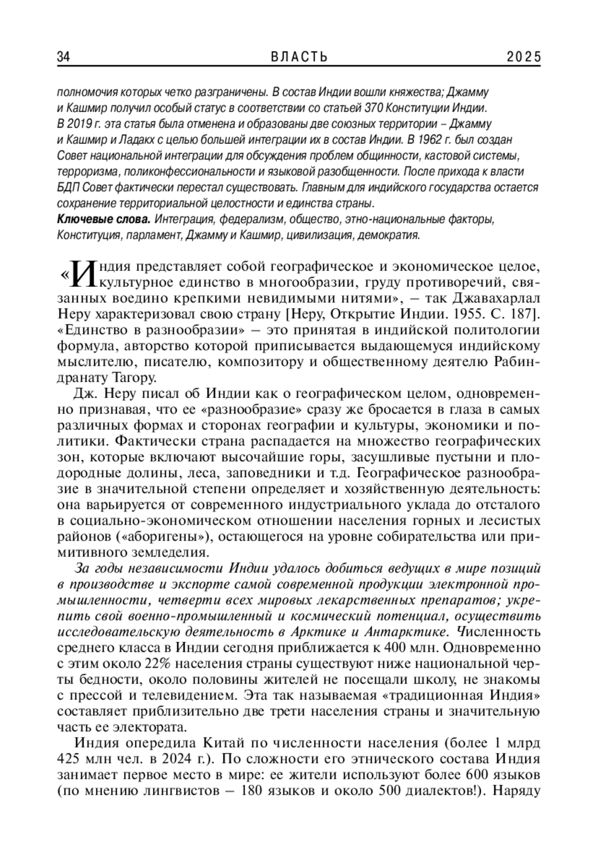 Ключевые фразы: интеграция, ФЕДЕРАЛИЗМ, общество, этно-национальные факторы, конституция, парламент, джамму и кашмир, цивилизация, демократия