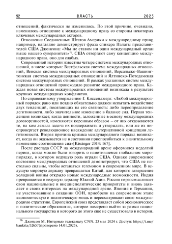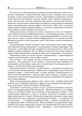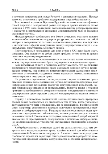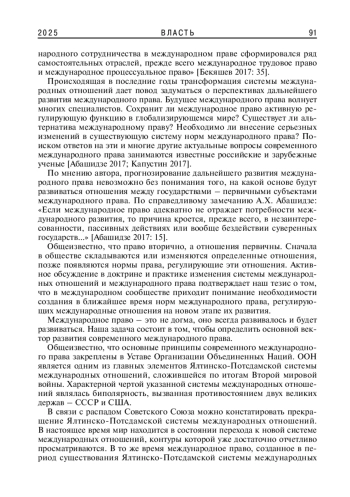 Международное право всегда развивалось и будет развиваться. Созданный в послевоенный период международный правопорядок с центральной ролью ООН и универсальными международно-правовыми инструментами фактически приостановил свое действие в условиях системной конфронтации между Западом и Россией. Основные многосторонние договоры и соглашения, направленные на предотвращение ядерных испытаний, поддержание ядерного паритета, ограничение вооружений и опасной военной деятельности, практически прекратили свое действие вследствие выхода из них в одностороннем порядке США или приостановки действия в ответ на это с российской стороны. Следует ожидать резкого возрастания интереса и соперничества за ресурсы малоосвоенных регионов, в первую очередь Арктики. Следующими шагами станут «зашельфовые» пространства Мирового океана. Вместе с тем достижения в области технологий, особенно в таких областях, как искусственный интеллект, биотехнологии и возобновляемые источники энергии, будут продолжать формировать новую политэкономию глобального развития. В связи с этим в международном сообществе приходит понимание необходимости создания норм международного права, регулирующих международные отношения на новом этапе их развития.