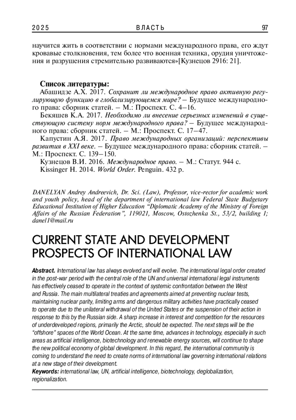 1. Абашидзе А.Х. 2017. Сохранит ли международное право активную регулирующую функцию в глобализирующемся мире? - Будущее международного права: сборник статей. - М.: Проспект. С. 4-16.