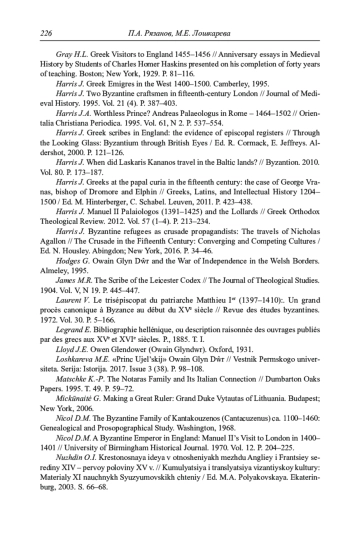 18. Gray H.L. Greek Visitors to England 1455-1456 // Anniversary essays in Medieval History by Students of Charles Homer Haskins presented on his completion of forty years of teaching. Boston; New York., 1929. P. 81-116.
