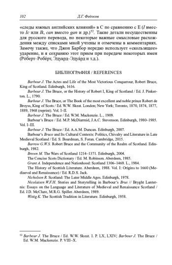 14. Nicolaisen W.F.H. Stories and Storytelling in Barbour’s Brus // Bryght Lanternis: Essays on the Language and Literature of Medieval and Renaissance Scotland / Ed. J.D. McClure, M.R.G. Spiller. Aberdeen, 1989.