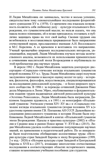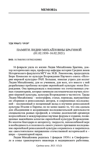 16 февраля ушла из жизни Лидия Михайловна Брагина, доктор исторических наук, профессор кафедры истории Средних веков Исторического факультета МГУ им. М. В. Ломоносова, председатель Бюро Комиссии по культуре Возрождения Научного совета «История мировой культуры» РАН.