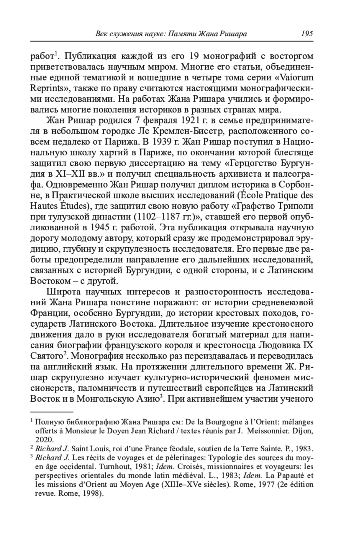 25 января 2021 г. ушел из жизни Жан Ришар – известнейший французский ученый-медиевист XX – начала XXI в., профессор университета в Дижоне, представитель Школы хартий, член многих академических исторических и археологических обществ. С 1987 г. Жан Ришар – член Академии надписей и изящной словесности (Académie des Inscriptions et Belles-Lettres) и с 2002 г. ее президент; с 1968 по 2015 г. – президент старейшего во Франции Общества словесности, наук и искусств (Société éduenne des lettres, sciences et arts), занимающегося почти уже два столетия изучением истории Бургундии; первый президент Общества изучения истории крестовых походов и Латинского Востока (Society for the Study of the Crusades and the Latin East), основанного в 1980 г.; в 1968–1971 гг. декан Факультета словесности университета в Дижоне; президент «Региональной ассоциации сохранения наследия Бургундии»; член Академии Морвана; член «Европейского общества по изучению истории Бургундии»; член историко-археологического «Общества антикваров Франции»; член «Общества искусств в Женеве» и почетный член «Общества кипрских исследований».