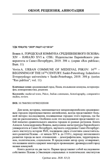 Статья: ВОВИН А. ГОРОДСКАЯ КОММУНА СРЕДНЕВЕКОВОГО ПСКОВА: XIV - НАЧАЛО XVI В. СПБ.: ИЗДАТЕЛЬСТВО ЕВРОПЕЙСКОГО УНИВЕРСИТЕТА В САНКТ-ПЕТЕРБУРГЕ, 2019. 398 С. (СЕРИЯ "RES PUBLICA"; ВЫП. 11) (2021)