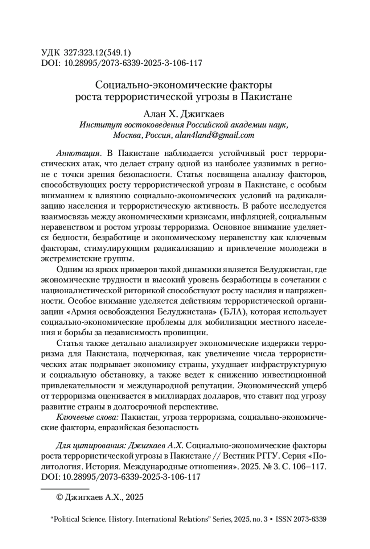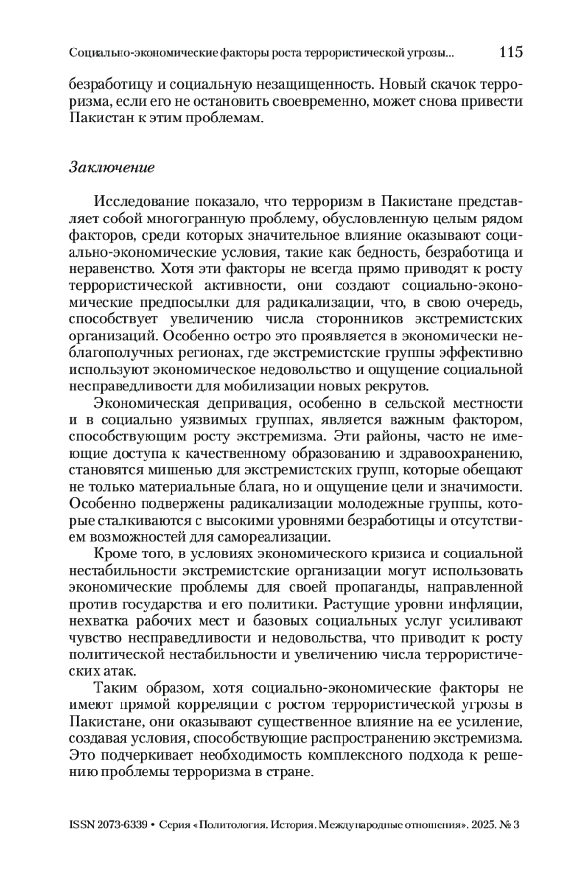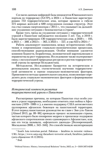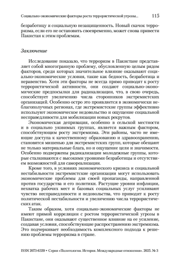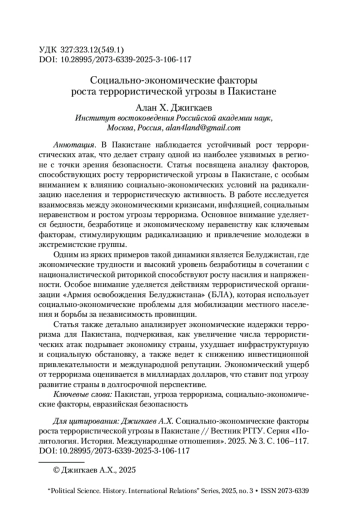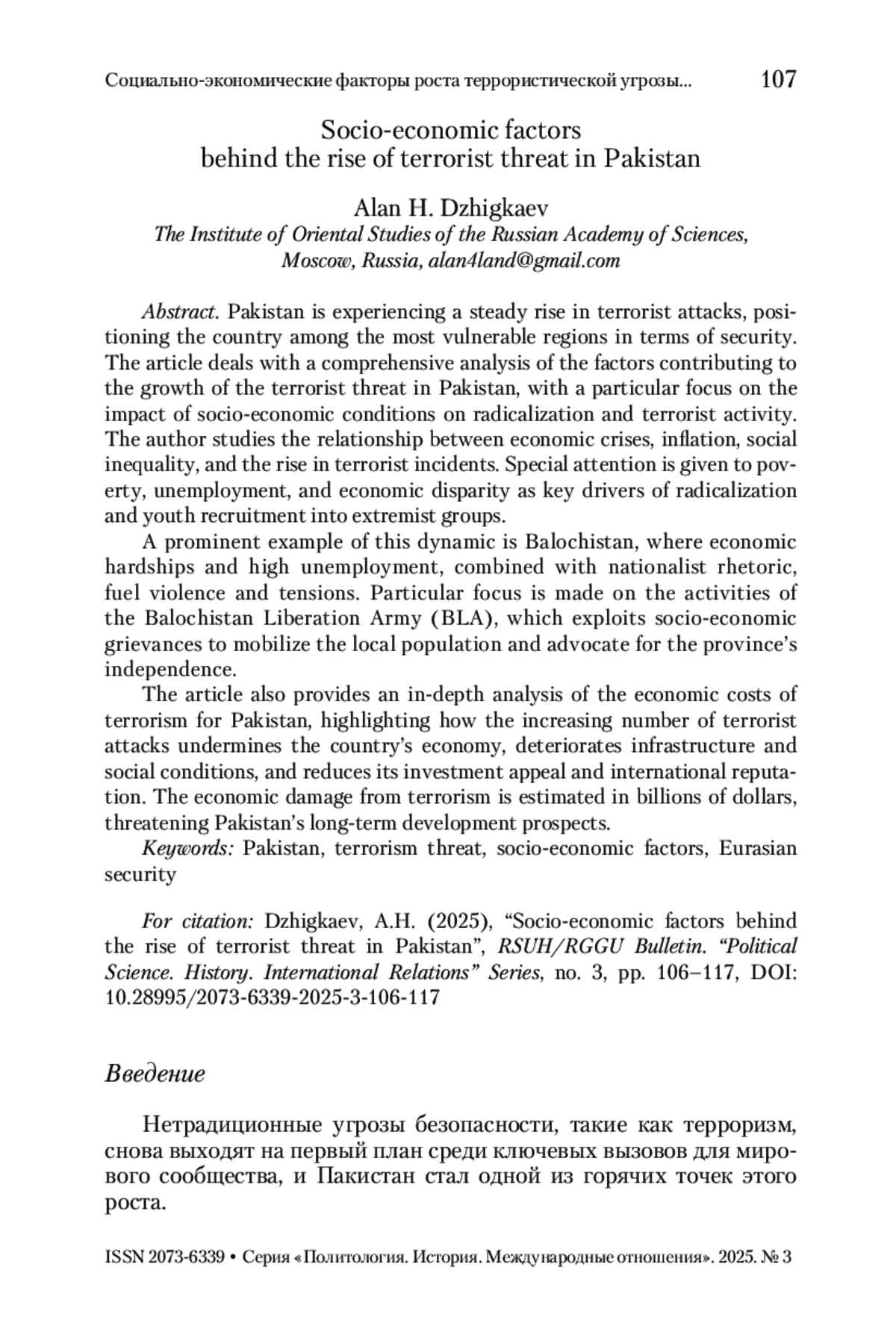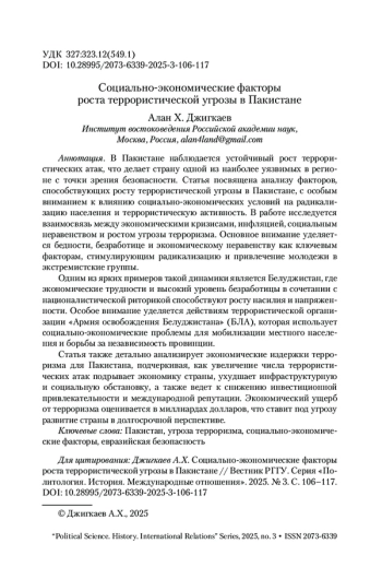 В Пакистане наблюдается устойчивый рост террористических атак, что делает страну одной из наиболее уязвимых в регионе с точки зрения безопасности. Статья посвящена анализу факторов, способствующих росту террористической угрозы в Пакистане, с особым вниманием к влиянию социально-экономических условий на радикализацию населения и террористическую активность. В работе исследуется взаимосвязь между экономическими кризисами, инфляцией, социальным неравенством и ростом угрозы терроризма. Основное внимание уделяется бедности, безработице и экономическому неравенству как ключевым факторам, стимулирующим радикализацию и привлечение молодежи в экстремистские группы. Одним из ярких примеров такой динамики является Белуджистан, где экономические трудности и высокий уровень безработицы в сочетании с националистической риторикой способствуют росту насилия и напряженности. Особое внимание уделяется действиям террористической организации «Армия освобождения Белуджистана» (БЛА), которая использует социально-экономические проблемы для мобилизации местного населения и борьбы за независимость провинции. Статья также детально анализирует экономические издержки терроризма для Пакистана, подчеркивая, как увеличение числа террористических атак подрывает экономику страны, ухудшает инфраструктурную и социальную обстановку, а также ведет к снижению инвестиционной привлекательности и международной репутации. Экономический ущерб от терроризма оценивается в миллиардах долларов, что ставит под угрозу развитие страны в долгосрочной перспективе.