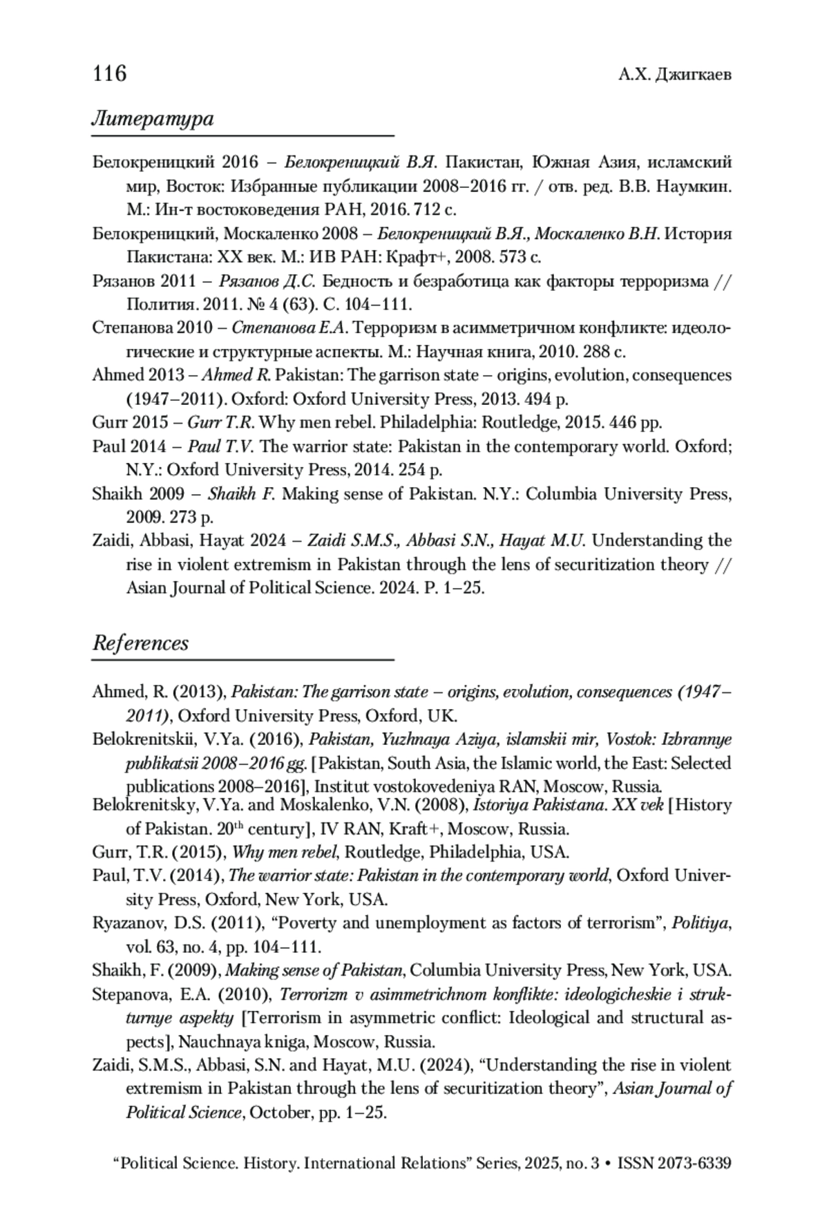 9. Zaidi, Abbasi, Hayat 2024 - Zaidi S.M.S., Abbasi S.N., Hayat M.U. Understanding the rise in violent extremism in Pakistan through the lens of securitization theory // Asian Journal of Political Science. 2024. P. 1-25.