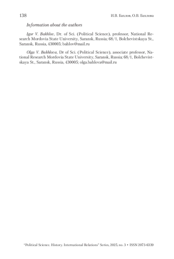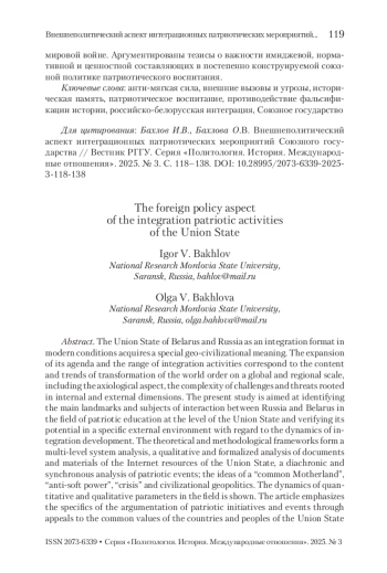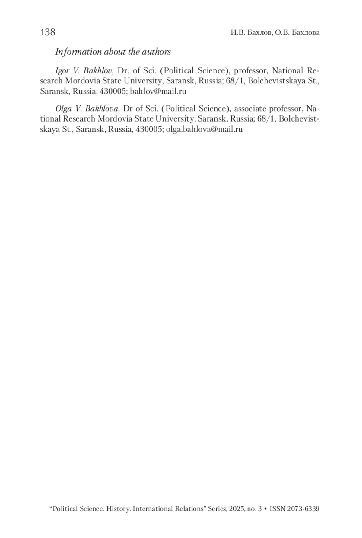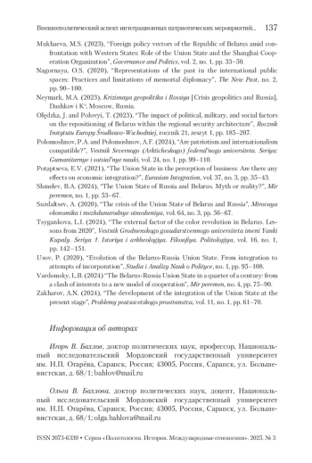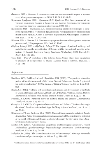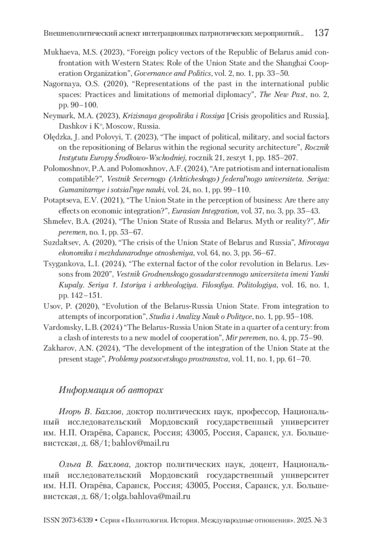 1. Бахлова, Бахлов, Уляшкина 2023 - Бахлова О.В., Бахлов И.В., Уляшкина Е.Г. Политика патриотического воспитания в рамках Союзного государства Беларуси и России: потенциал институционализации // Вестник Российского университета дружбы народов. Серия: Политология. 2023. Т. 25. № 4. С. 940-952.