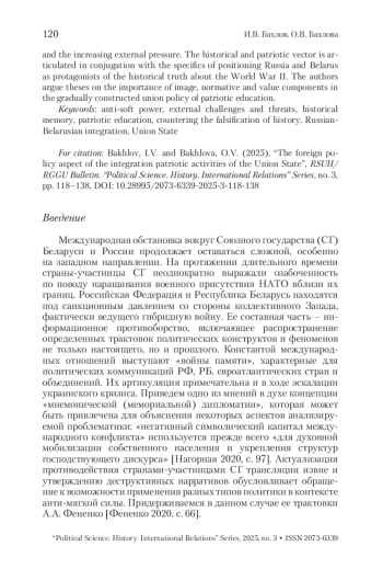 Союзное государство Беларуси и России как интеграционный формат в современных условиях обретает особый геоцивилизационный смысл. Расширение его повестки и спектра интеграционных мероприятий корреспондирует с содержанием и тенденциями трансформации мироустройства глобального и регионального масштаба, включая аксиологический аспект, усложнением вызовов и угроз, коренящихся во внутреннем и внешнем измерениях. Настоящее исследование ориентировано на выявление основных ориентиров и сюжетов взаимодействия России и Беларуси в сфере патриотического воспитания на уровне Союзного государства и верификацию его потенциала в специфической внешней среде с учетом динамики интеграционного развития. Теоретико-методологические рамки образуют многоуровневый системный анализ, качественный и формализованный анализ документов – материалов интернет-ресурсов Союзного государства, диахронный и синхронный анализ патриотических мероприятий; идеи «общего Отечества», «антимягкой силы», «кризисной» и цивилизационной геополитики. Показана динамика количественных и качественных параметров в данной области. Акцентирована специфика аргументации патриотических инициатив и мероприятий посредством апелляций к общим ценностям стран и народов Союзного государства и усиливающемуся внешнему давлению. Артикулирован историко-патриотический вектор, сопрягающийся с особенностями позиционирования России и Беларуси как протагонистов исторической правды о Второй мировой войне. Аргументированы тезисы о важности имиджевой, нормативной и ценностной составляющих в постепенно конструируемой союзной политике патриотического воспитания.